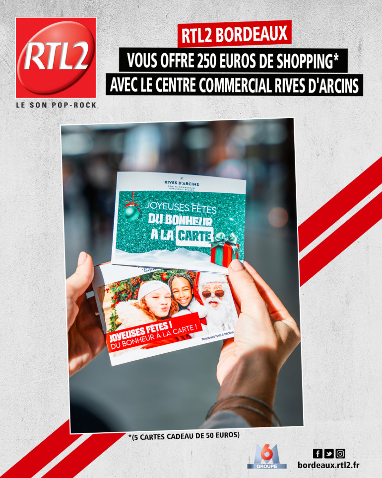 A quelques jours de Noël et dans l'urgence des cadeaux qui vont avec, toute cette semaine, RTL2 Bordeaux vous offre vos cartes cadeaux de 50€ par jour valable dans l'ensemble des boutiques du centre commercial Rives d'Arcins Bordeaux-Bègles !