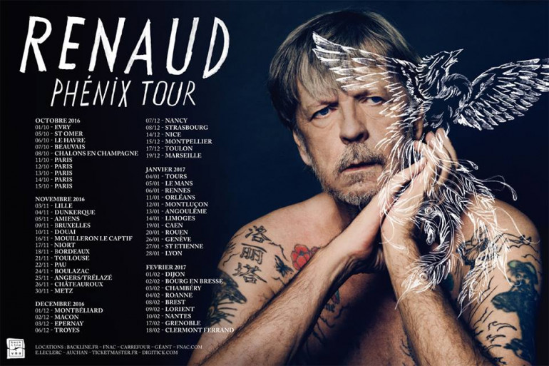 Sur la photo annonçant son retour sur scène, l'interprète de Mistral Gagnant apparaît torse nu, le regard vers l'horizon, avec un phénix dessiné au niveau des mains. Renaud a l'air en forme. Le chanteur ne se contente pas de quelques concerts, il annonce une tournée de plus de cinquante dates à travers toute la France, à partir du 1er octobre 2016, avec pas moins de 5 dates, du 11 au 15 octobre, au Zénith de Paris. La mise en vente des places aura lieu le 17 mars.