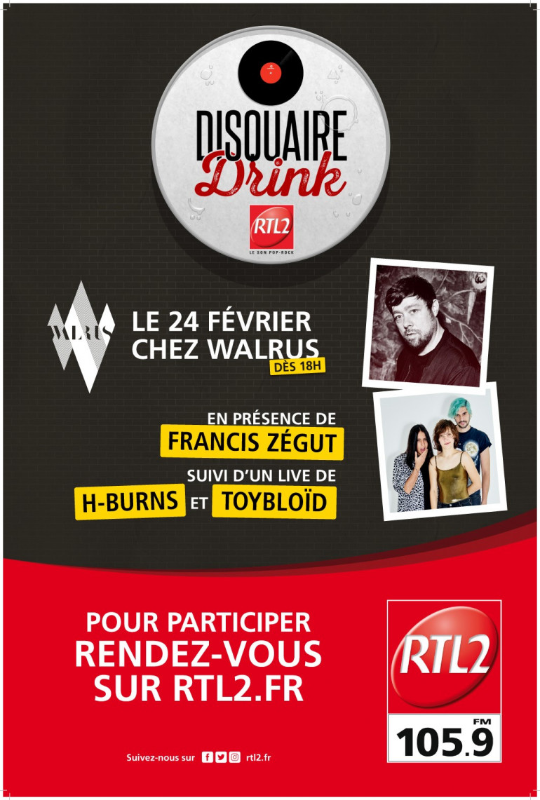 Amis passionnés de son pop-rock… nous vous donnons donc RDV le vendredi 24 février à partir de 18h chez Walrus (34 ter rue de Dunkerque 75010 PARIS) pour ce second Disquaire Drink RTL2 en compagnie de Francis Zégut, H-Burns et Toybloïd.