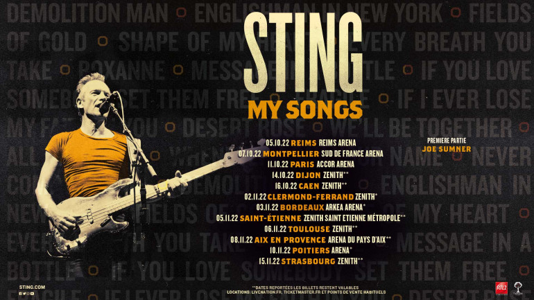 The Cherrytree Music Company et Live Nation ont annoncé mardi 10 mai 2022 que les concerts "My Songs" de Sting récemment reportés ont maintenant été reprogrammés à l’automne 2022. Également confirmé, 3 nouvelles dates en France ont été ajoutées au calendrier de la tournée. Les nouvelles dates incluent des représentations à Clermont-Ferrand au Zénith le 2 novembre, un spectacle à Bordeaux à l’Arkéa Arena le 3 novembre et à Poitiers à l’Arena le 10 novembre. Et c'est ce lundi 27 juin que les organisateurs ont annoncé l'ultime date de la tournée qui aura lieu le 23 octobre au Zénith de Lille.
