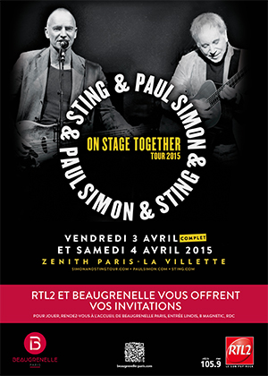 Du lundi 9 au lundi 23 février inclus, RTL2 & Beaugrenelle vous offrent vos invitations pour les concerts de Sting & Paul Simon au Zénith de Paris les 3 & 4 avril 2014.