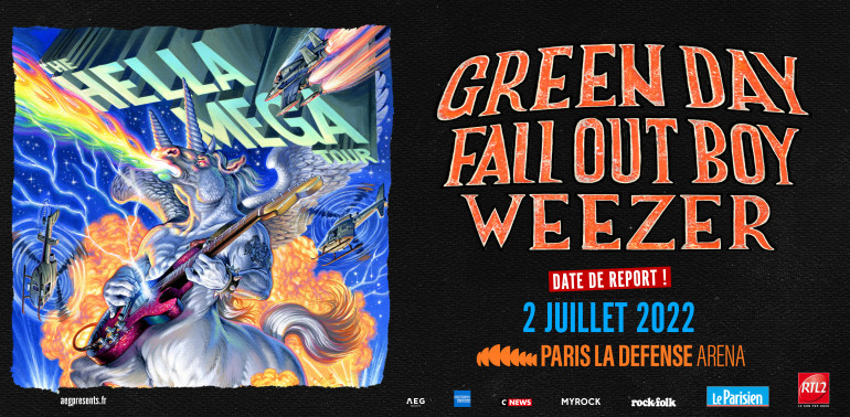 En raison de la crise sanitaire et suite aux restrictions toujours en cours sur les événements publics, le concert de The Hella Mega Tour avec Green Day, Fall Out Boy et Weezer prévu initialement en 2020 puis 2021 est reporté au 2 juillet 2022, toujours à La Défense Arena à Paris.