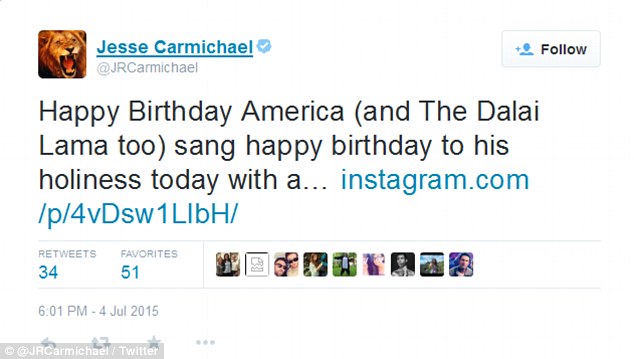 Jesse Carmichael avait tweeté le 4 juillet dernier "Joyeux anniversaire à l'Amérique (et au Dalaï Lama aussi) j'ai chanté joyeux anniversaire à sa sainteté aujourd'hui", après sa rencontre avec le leader Tibétain à l'occasion des célébrations du 80e anniversaire de ce dernier.