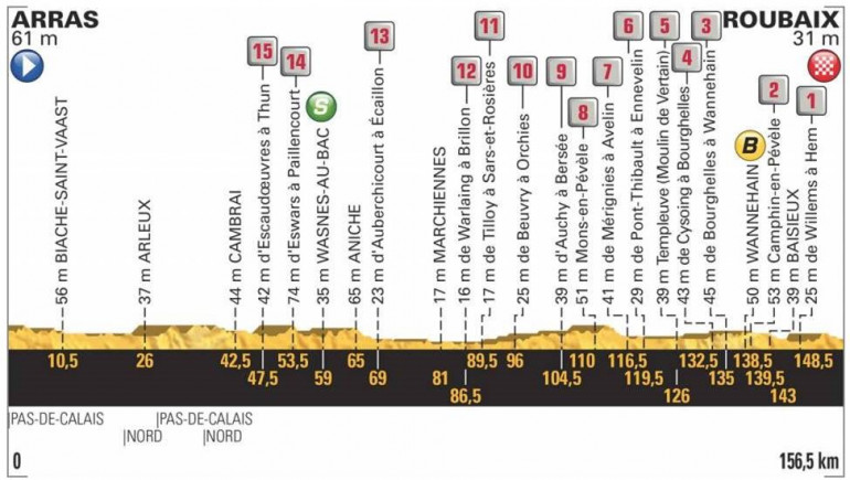 Il y a bien longtemps que les pavés sur le parcours du Tour de France n'ont pas atteint le kilométrage des 21,7 kilomètres qui sont proposés. Quinze secteurs seront répartis sur l'ensemble de l'étape dont notamment, dans le final, celui de Camphin-en-Pévèle (1,8 km).