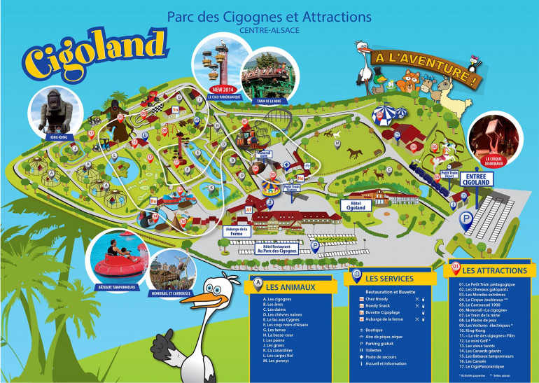 Depuis 40 ans, le Parc Cigoland a choisi de privilégier des attractions accessibles à tous et de sensibiliser les différents publics aux écosystèmes spécifiques au Centre Alsace (au Ried) et plus particulièrement à celui de la Cigogne Blanche. Loin de la course folle aux manèges à sensations fortes, les visiteurs peuvent observer des cigognes en liberté ou dans l’une des cinq volières du parc ainsi que de nombreuses autres espèces d’animaux, entourés de la végétation luxuriante et diversifiée typique du Ried. Le parc, aujourd’hui sous la direction de Patrice Willmann, fils cadet de Jean Pierre, confirme cet état d’esprit et poursuit son développement vers des dimensions pédagogiques, ludiques et de détente familiale. Une vingtaine d’attractions pour tous les âges et des dispositifs pédagogiques ont été développés ou renouvelés.