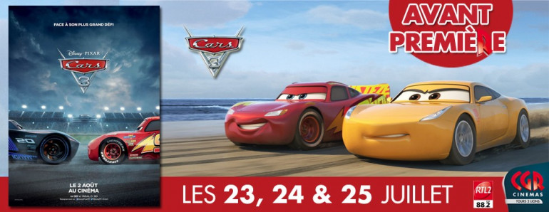 Cars 3 en avant-première les 23 juillet ( 11h00), 24 juillet en 3D (16h00), 25 juillet (18h00) au CGR Deux Lions avec RTL2 Touraine.