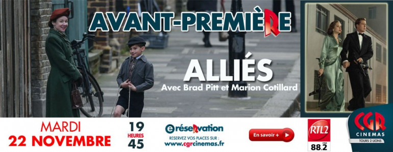 Cette semaine gagnez vos invitations pour le film Alliés mardi 22 novembre au CGR Deux Lions à Tours à 19h45. Pour jouer, envoyez vos coordonnées complètes (nom, prénom, adresse, numéro de téléphone) à tours@rtl2.fr avec en objet du mail " Jeu Alliés".