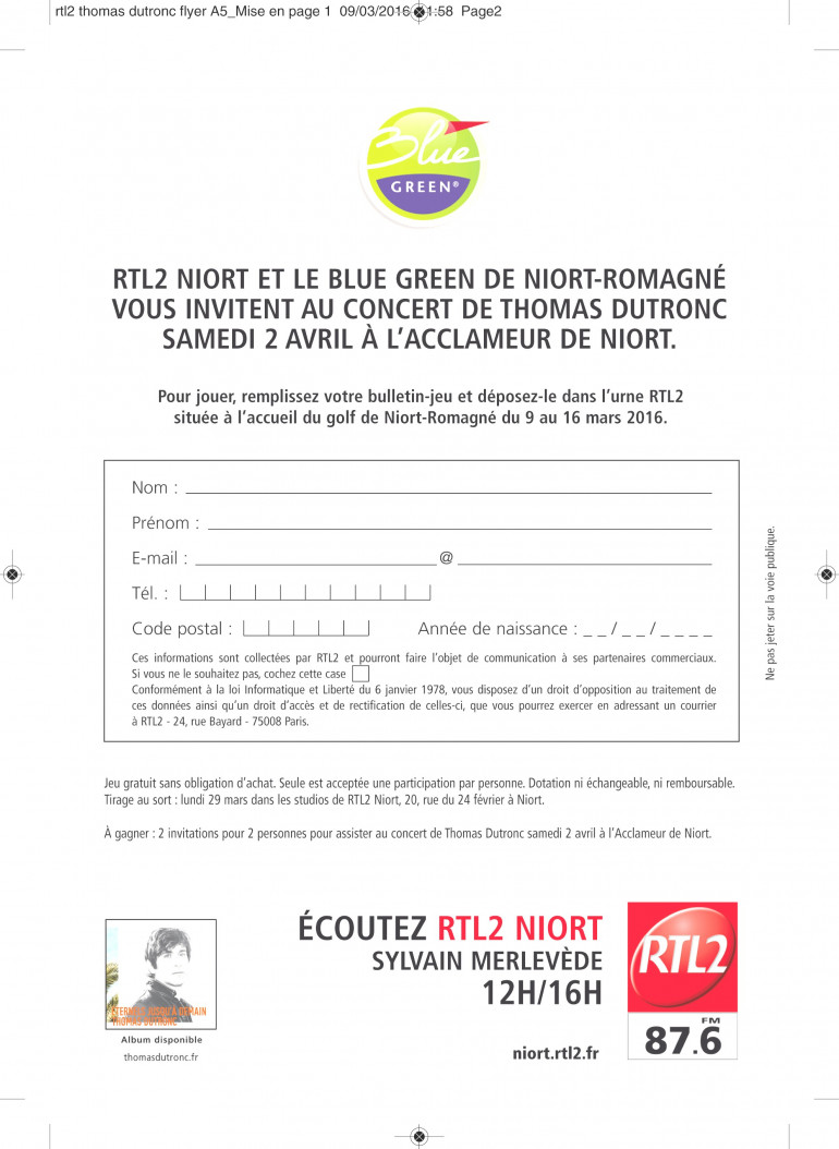A l'occasion des Portes Ouvertes du Golf Blue Green de Niort-Romagné, du 18 mars au 03 avril, RTL2 Niort vous offre vos invitations pour le concert de Thomas Dutronc, samedi 02 avril à L'Acclameur à Niort!