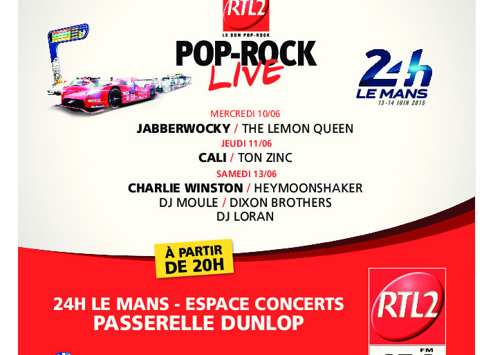 A l'occasion des 24 heures du Mans du 7 au 14 juin, RTL2 présente le RTL2 POP-ROCK LIVE ! 3 jours de concerts avec Jabberwocky, Cali, Charlie Winston, et DJ Loran aux platines !