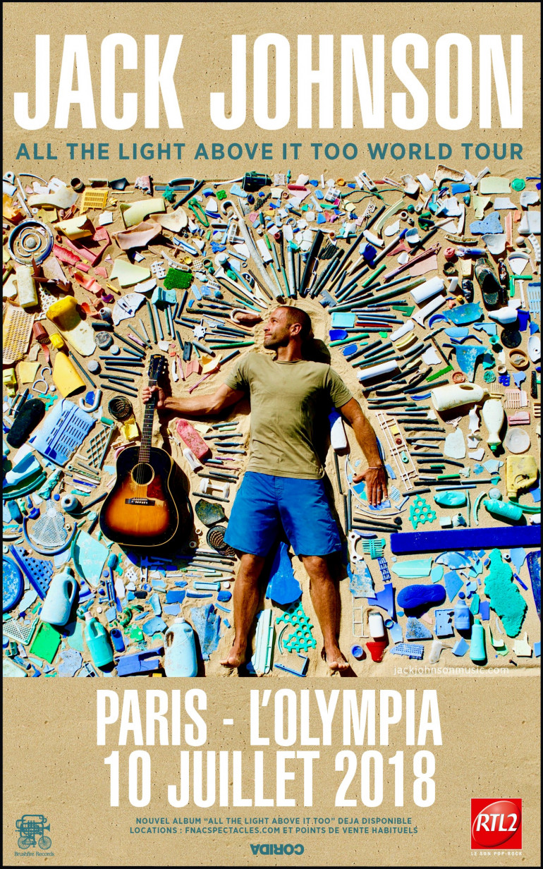 Jack Johnson a passé son enfance à surfer et à jouer de la guitare sur les plages de Hawaï. Depuis 2001, il a sorti 7 albums et 2 albums live qui se sont vendus à plus de 25 millions d'exemplaires dans le monde. Le dernier album de Jack, All The Light Above it Too, sorti en septembre 2017, a été classé #4 sur le « Billboard Top 200 Albums ». Son label Brushfire Records et son équipe de tournée ont été des chefs de file dans l'écologisation de l'industrie de la musique, et son réseau d'action sociale All At Once relie les fans à des organismes locaux à but non lucratif. Jack et son épouse Kim, ont fondé la Fondation Kokua Hawaii pour soutenir l'éducation environnementale dans les écoles et les communautés d'Hawaï, ainsi que la Fondation Johnson Ohana pour soutenir l'éducation environnementale, artistique et musicale dans le monde entier. Les benefices de ses albums, tournées et de ses activités philanthropiques personnelles, remontent a une somme, de plus de 30 milllions de dollars, donné à des œuvres caritatives depuis 2001. Pour la première fois depuis 2014, Johnson a pris la route pour sa tournée All The Light Above it Too, en Amérique du Nord, Amérique du Sud, Australie, Nouvelle-Zélande, et l’Europe.