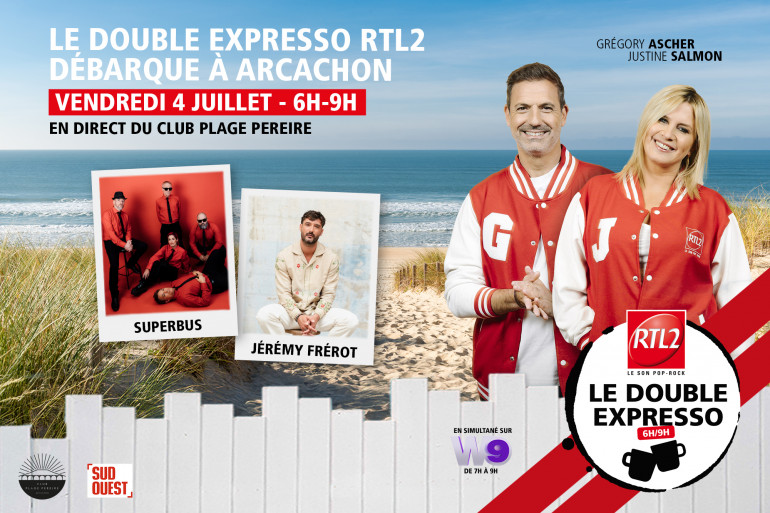 Grégory Ascher, Justine Salmon et toute l’équipe du Double Expresso RTL2 débarquent vendredi 4 juillet 2025 à Arcachon, au Club Plage Pereire, pour une émission exceptionnelle en public et en direct face à l’océan.