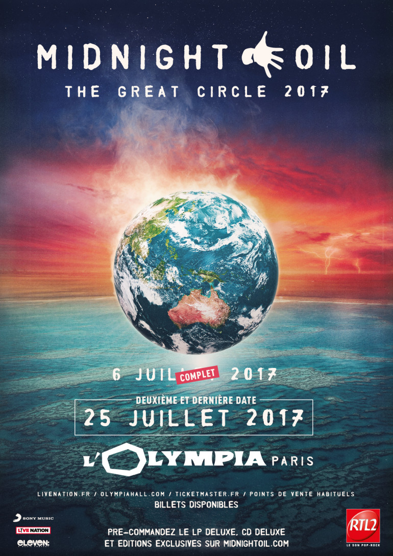 Dans le cadre de leur tournée mondiale THE GREAT CIRCLE, Midnight Oil se produira sur la scène mythique de L'Olympia le 25 juillet 2017, pour une deuxième date parisienne qui clôturera en beauté leur tournée européenne.
