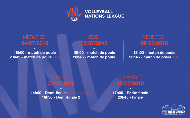 La VolleyBall Nations League, nouveau nom de la Ligue Mondiale de Volley, regroupe 16 équipes nationales masculines dont 12 permanentes et 4 challengers (sélectionnés sur des critères de performances). Après une phase de tours préliminaires, les 6 équipes finalistes s'affronteront donc au Stade lors de la phase finale, le "Final Six".