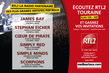 RTL2 En novembre, choisissez votre concert RTL2 RTL2 Touraine et meilleurtaux.com agence de Tours vous invitent à Paris pour le concert de votre choix avec le transport aller-retour et l'hôtel. Ecoutez RTL2 Touraine entre 12h et 16h et partez applaudir Coeur de Pirate, James Bay, Stéphan... publié le 23/10/2015 à 17:31
